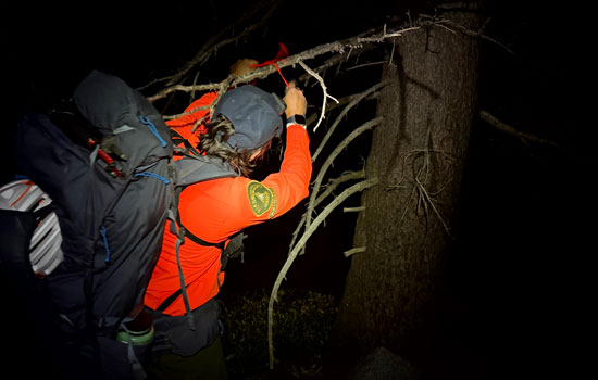 As well as final gear checks, communication checks, and route planning. Team 101 and Team 102 stepped off from the top of the Tram Station at about 9pm heading for Wellman Divide via the Round Valley Campground. From the Wellman Divide Teams 101 and 102 bushwacked through treacherous terrain heading W NW for roughly 1/2 miles and 600 vertical feet performing shoutouts and making verbal contact with the subject at about 11pm just east of Shirley Peak.