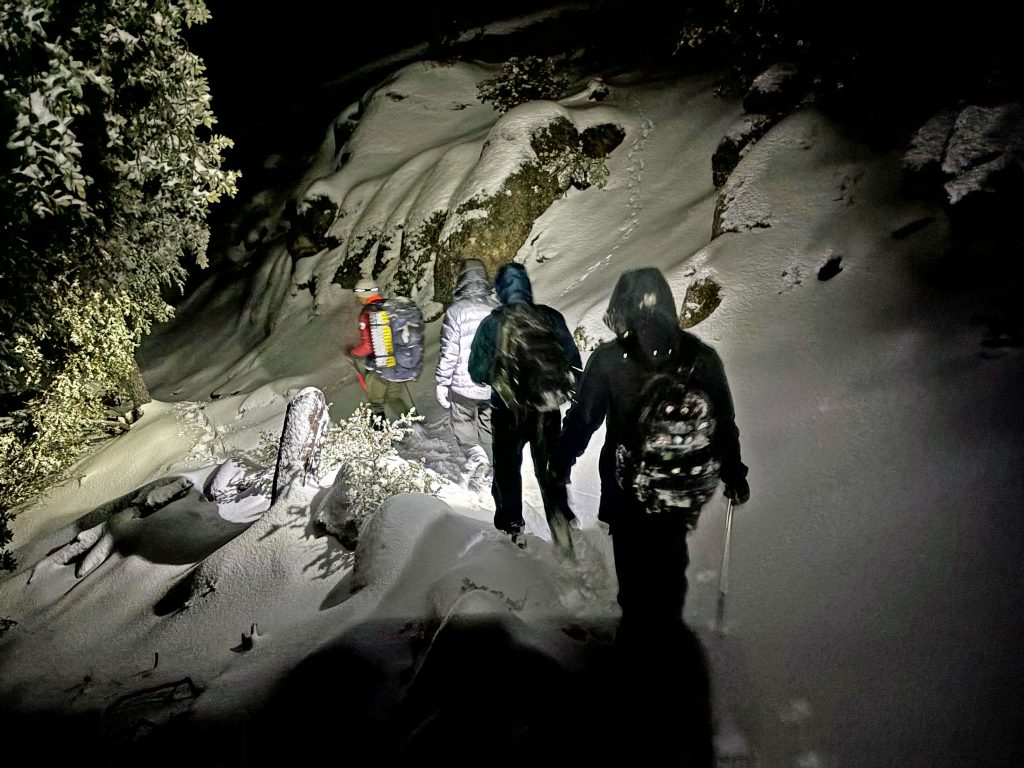 On Friday at 8:00 PM RMRU received a callout for two stranded hikers on the Deer Springs trail, approximately 1.5 miles from the trailhead. This callout came as the first major winter storm of the 2026 season was moving in, and it had already snowed approximately 6” in Idyllwild when the first searchers arrived at the trailhead around 10:00 PM. This was a busy night for RMRU as mission 2026-004 was taking place on the other side of the mountain to rescue two individuals on Skyline trail.